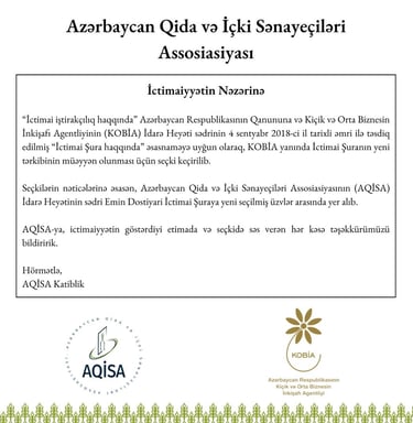 “İctimai iştirakçılıq haqqında” Azərbaycan Respublikasının Qanununa və Kiçik və Orta Biznesin İnkişafı Agentliyinin (KOBİA) İdarə Heyəti sədrinin 4 sentyabr 2018-ci il tarixli əmri ilə təsdiq edilmiş “İctimai Şura haqqında” əsasnaməyə uyğun olaraq, KOBİA yanında İctimai Şuranın yeni tərkibinin müəyyən olunması üçün seçki keçirilib.