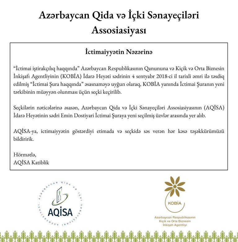 Seçkilərin nəticələrinə əsasən, Azərbaycan Qida və İçki Sənayeçiləri Assosiasiyasının (AQİSA) İdarə Heyətinin sədri Emin Dostiyari İctimai Şuraya yeni seçilmiş üzvlər arasında yer alıb.